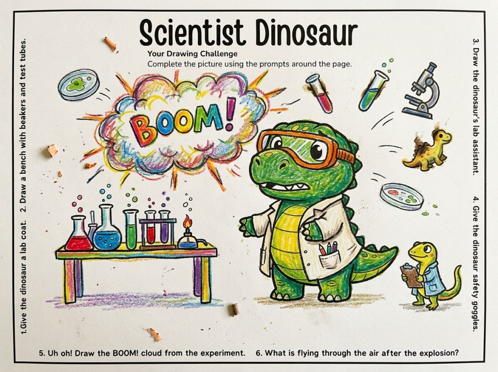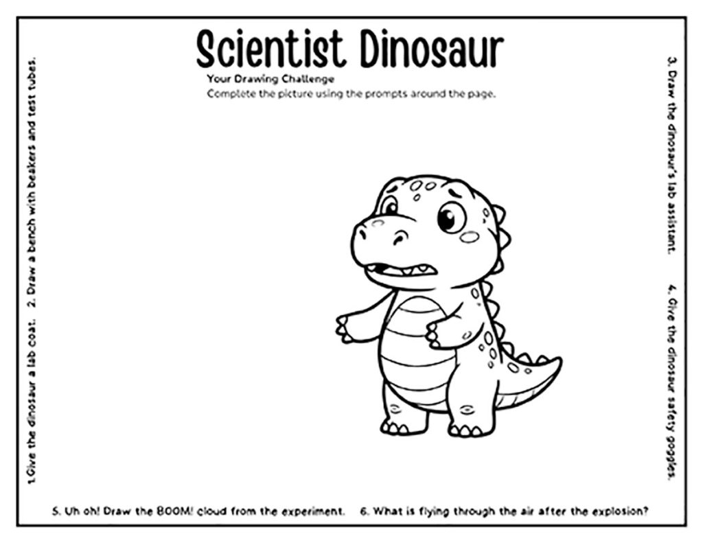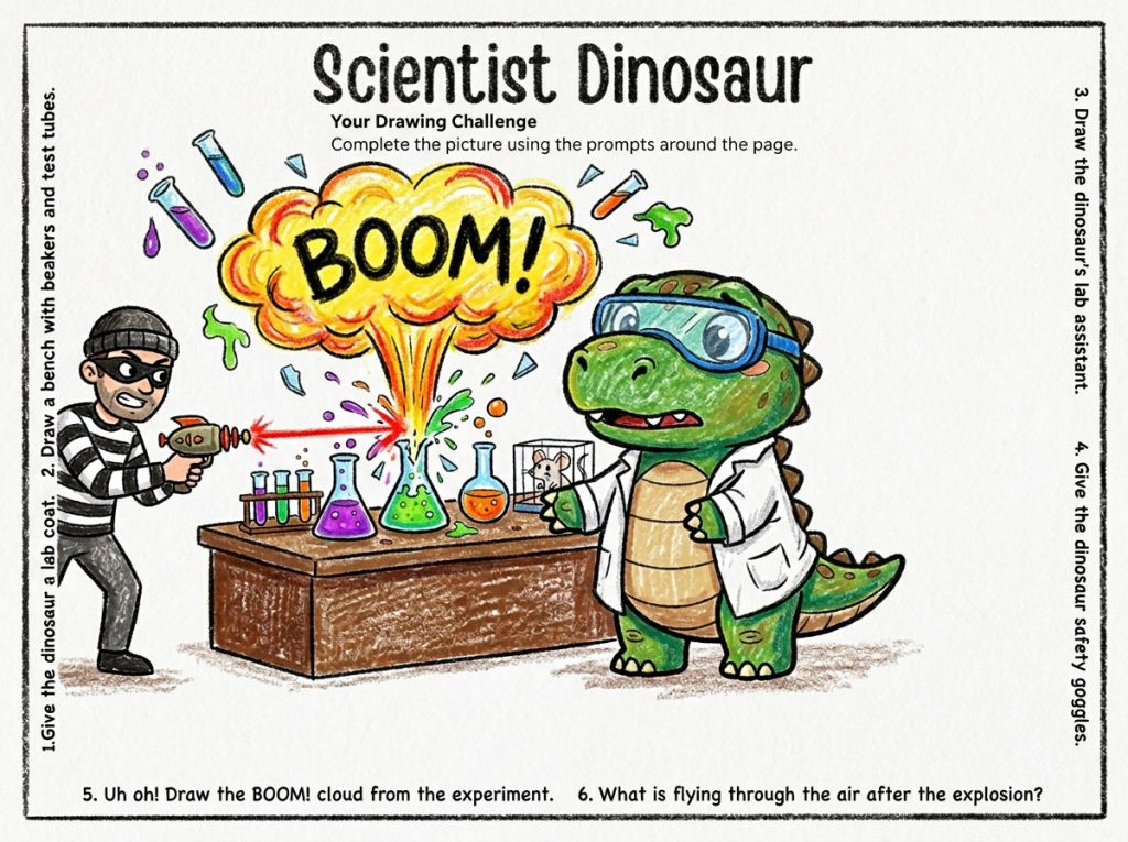 Instead of staring at a blank page, kids start halfway through the story – in this case, a slightly chaotic scientist dinosaur in the moment where he’s just realised his experiment is going horribly wrong.